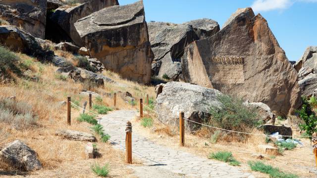 North of Baku, the Absheron Peninsula attracts the crowds in summer with its resorts and beaches, and you can venture here year-round to discover Azerbaijan’s fascinating fire-worshipping heritage. The Absheron’s other attractions include medieval towers, a winery and the Zira Cultural Centre and Eco Park, among others. South of Baku, the petroglyphs and mud volcanoes of Gobustan are one of Azerbaijan’s top attractions.