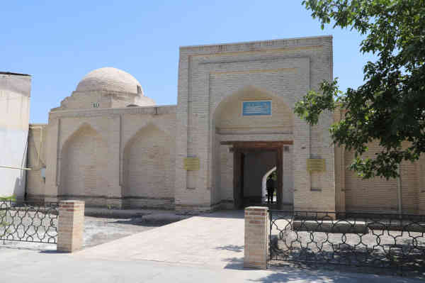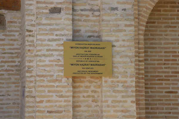 Miyon Hazrat Madrasah is a compound three-yard complex: two courtyards are located along the east-west axis, the third adjoins them from the south. The main entrance to the madrasah – on the western side of the southern courtyard – is marked with a portal-domed darvozakhona with wooden gates decorated with carved ornaments by the local craftsman Iskander Khoja. Residential buildings are tightly adjacent to the madrasah from all sides.