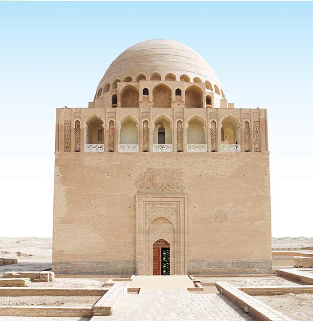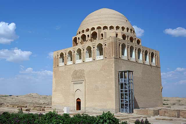 The Mausoleum of one of the most famous Seljuk sultans, Ahmad Sanjar, is located in Merv, in the center of the Sultan-Kala settlement. It looks like a medieval skyscraper, cube-shaped and crowned with turquoise-tiled outer dome. Under the dome are three-tiered open galleries in the form of alternating laced arches. The dome symbolically represented the firmament. The walls are 5 meters thick at the base. The mausoleum is 27 meters long and its total height is 38 meters.