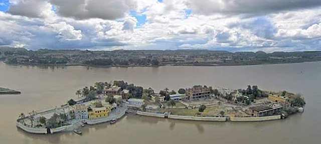 Sadh Belo is located in the Indus River flowing between Rohri and Sukkur, Sindh Pakistan.